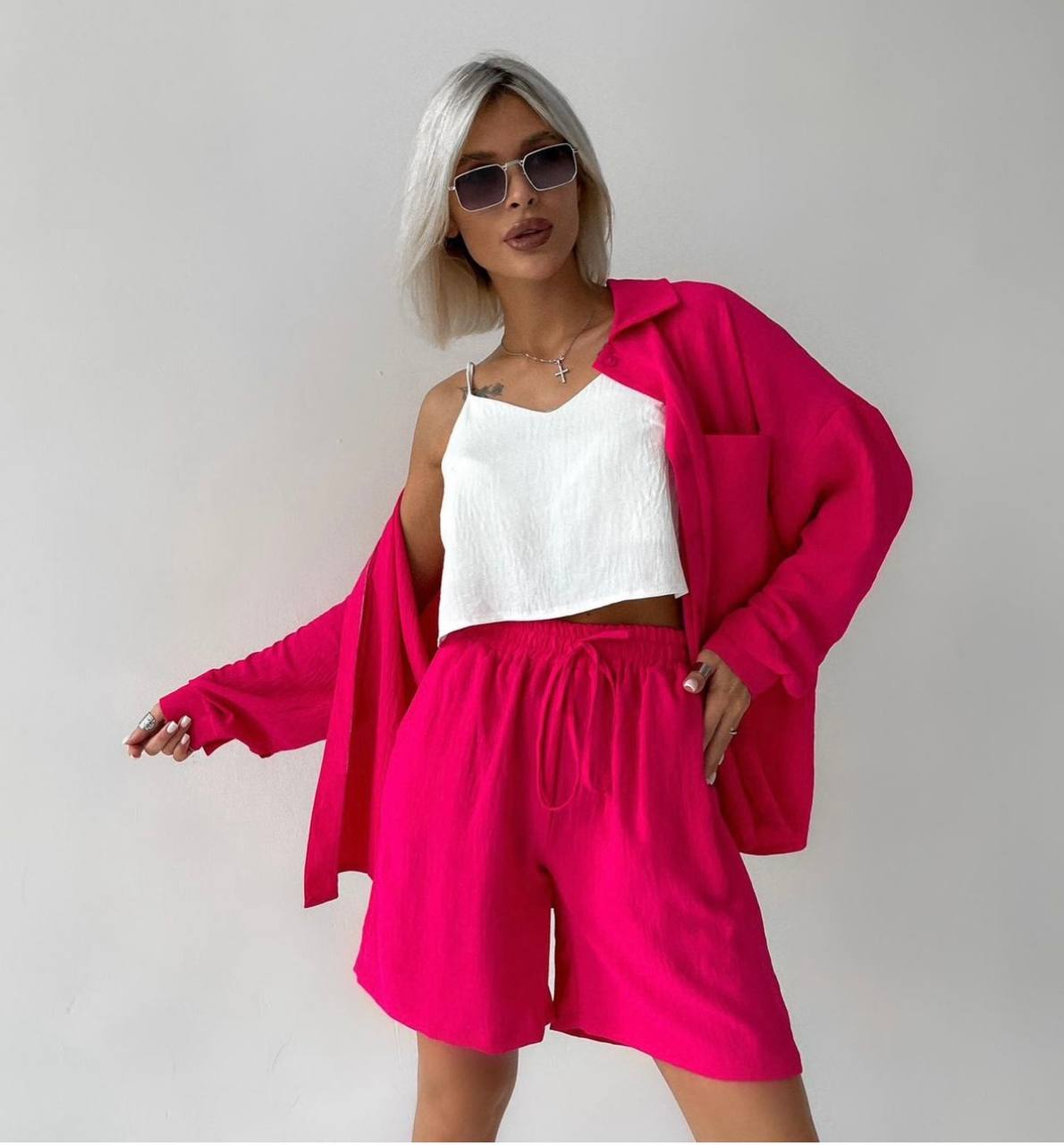 Очень крутой, легкий и удобный костюм, состоящий из рубашки, шорт и топа. Топ в размере 50-52 немного удлинен. Ткань не просвечивается.