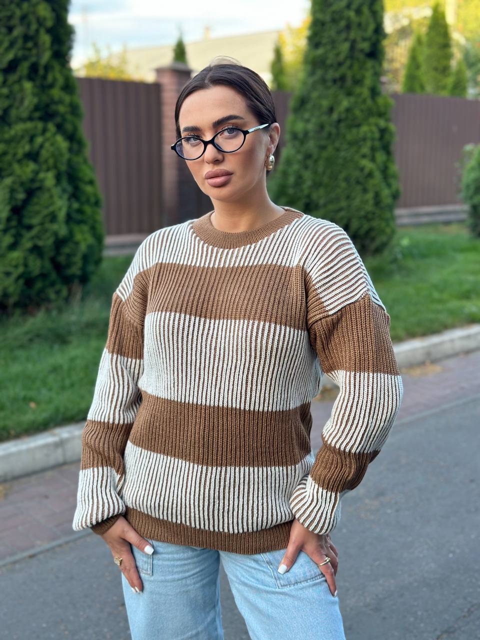 Очень мягкий теплый свитерок в крупную полоску шоколад