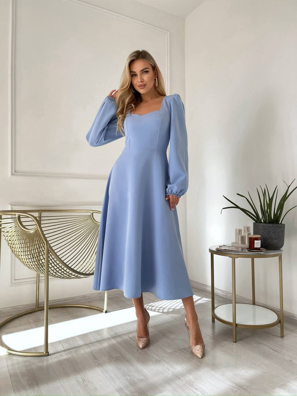 Очень нежное легкое платье с длинным рукавом голубой