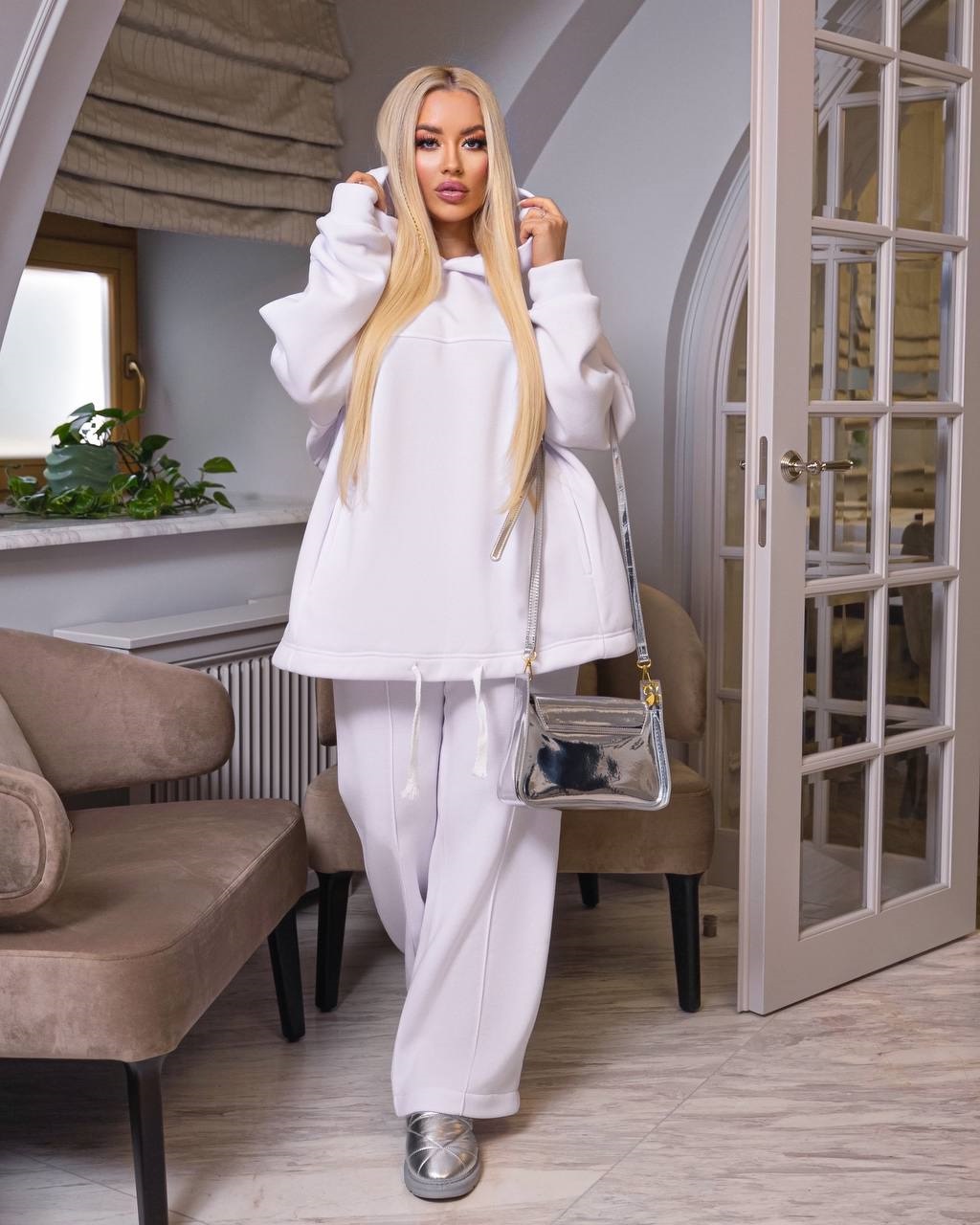 Очень теплый костюм Худи оверсайз удлиненный+Брюки палаццо с отсроченными стрелками белый
