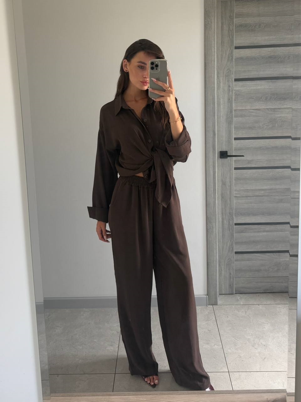Оверсайз костюм из летней ткани: рубашка+брюки-палаццо шоколад