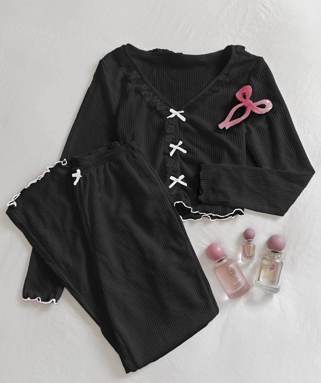 Пижама с кружевом и бантиками (кофта+штаны) черный