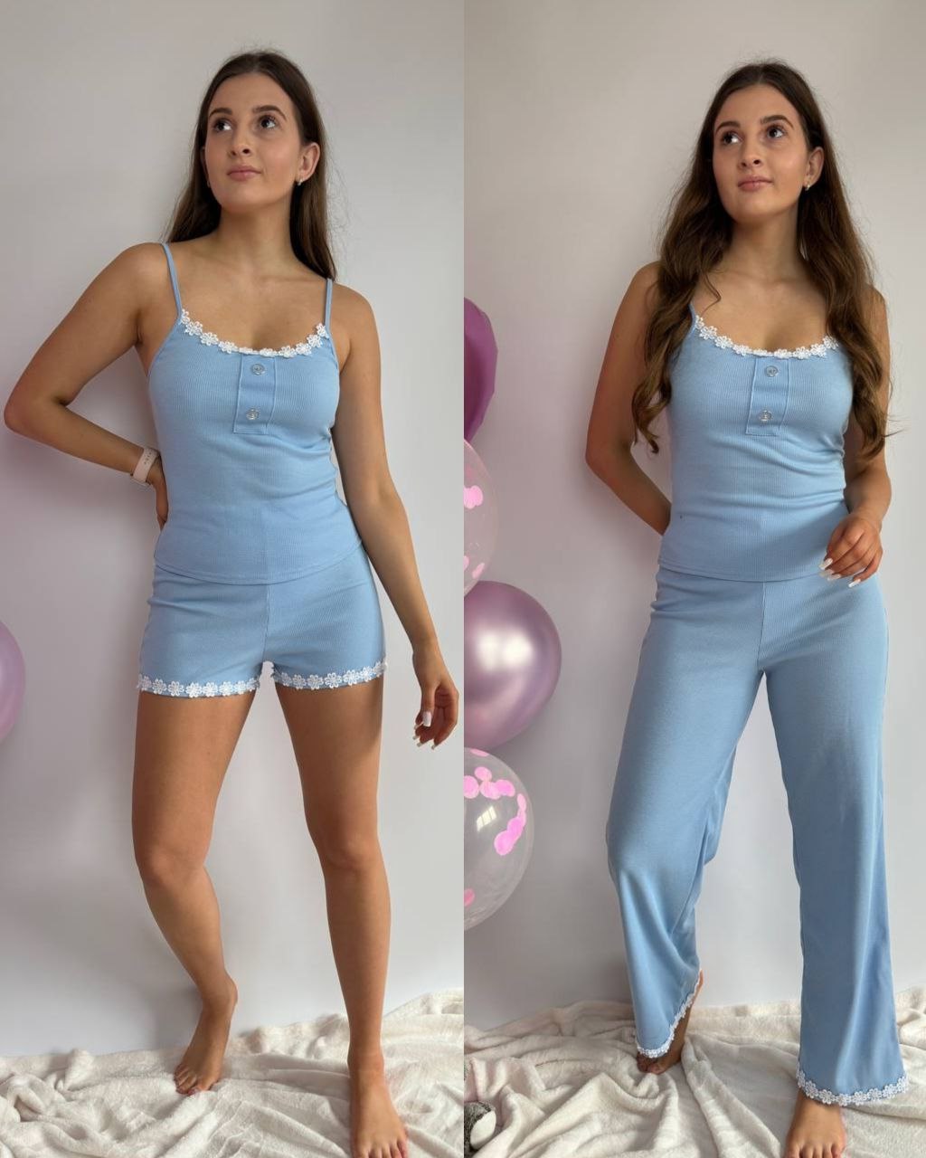 Пижама тройка майка+шорты+брюки трикотаж рубчик голубой