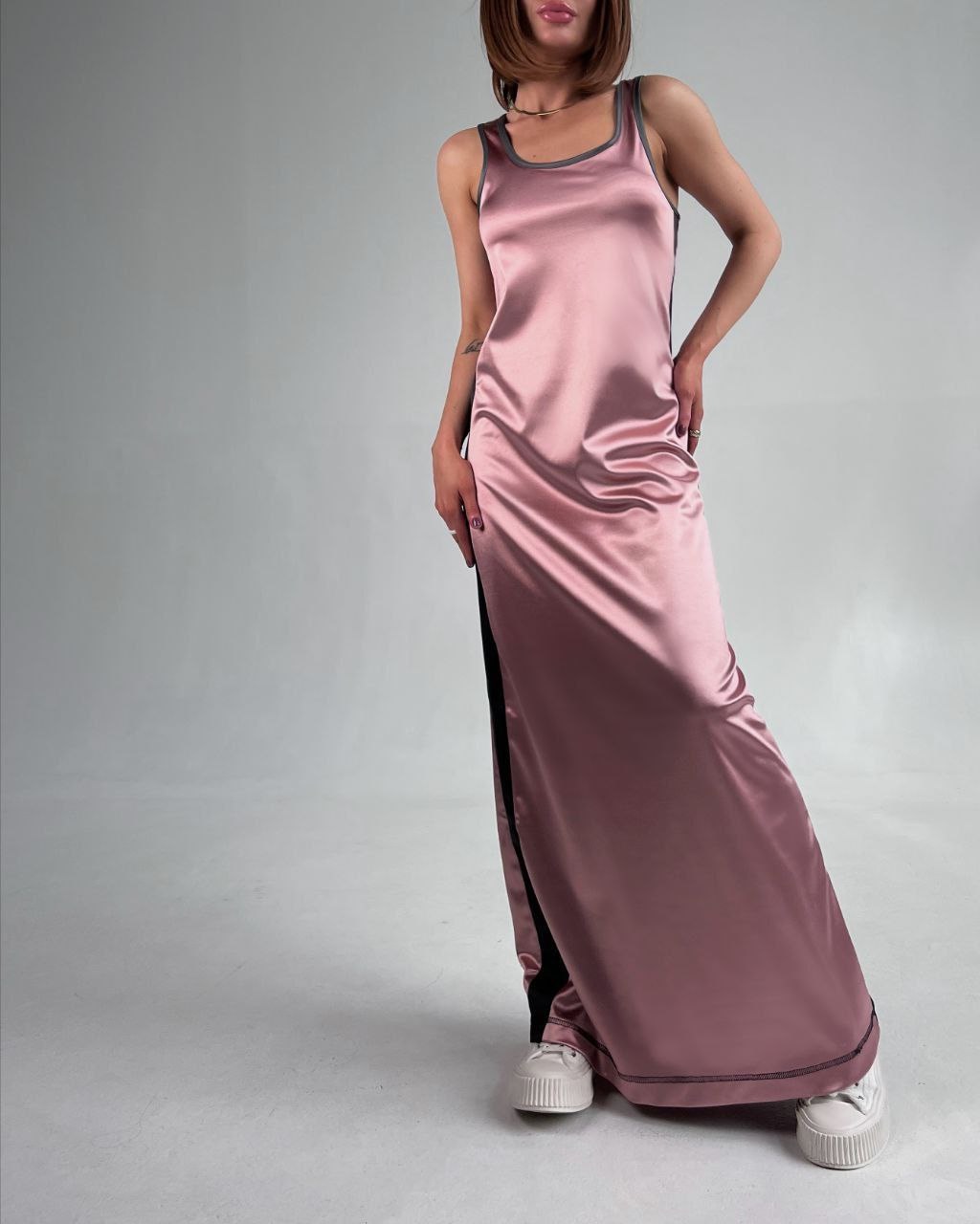 Будьте першим, хто залишив відгук “Платье длиной макси прямого силуэта с лампасами из атласа пудра”“