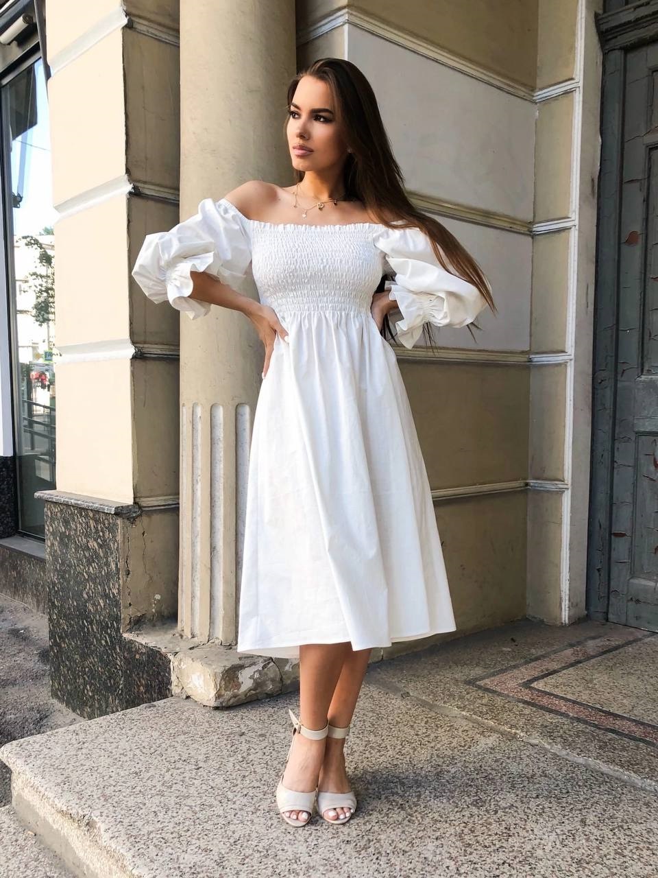 Платье длиной миди с открытыми плечами+ по верхней части настрочена резинка лен белый