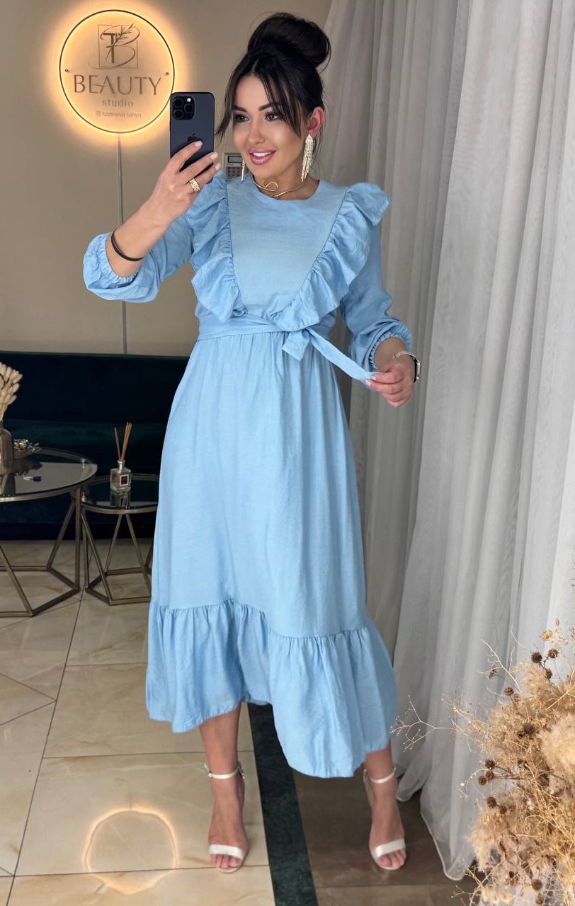 Платье длиной миди с рюшем на полочке+расклешенной юбкой с воланом голубой