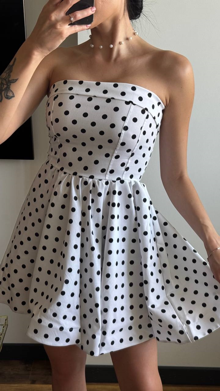 Мини-платье в горох — элегантная и в то же время игривая модель без бретель, подчеркивающая линию плеч и зону декольте.