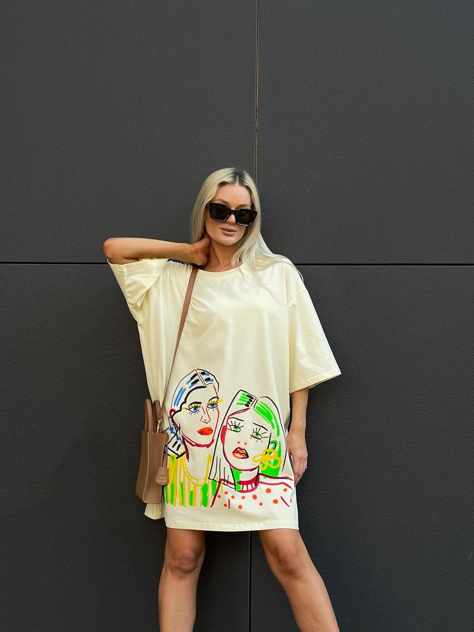 Платье-футболка свободный крой oversize с принтом Кремовый