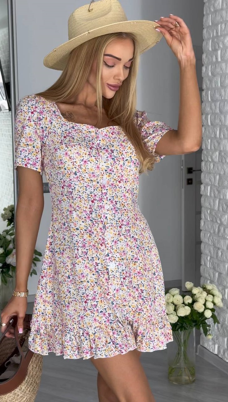 Платье из натуральной ткани в длине мини, с нежным цветочным принтом и романтичным рюшем.
