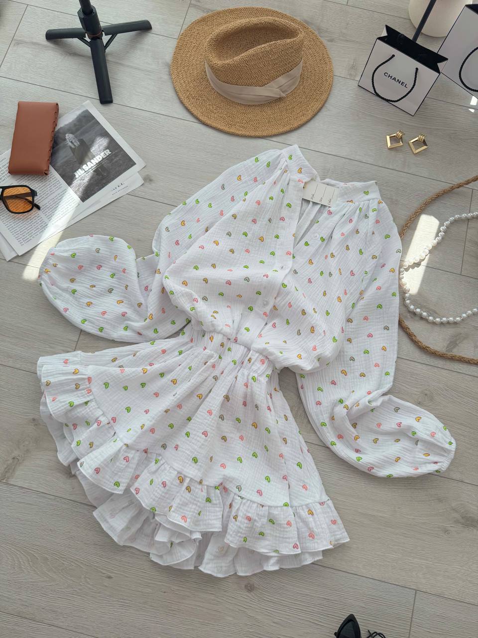 Будьте першим, хто залишив відгук “Платье-комбинезон с длинным рукавом (муслин) белая основа в Сердечка”“