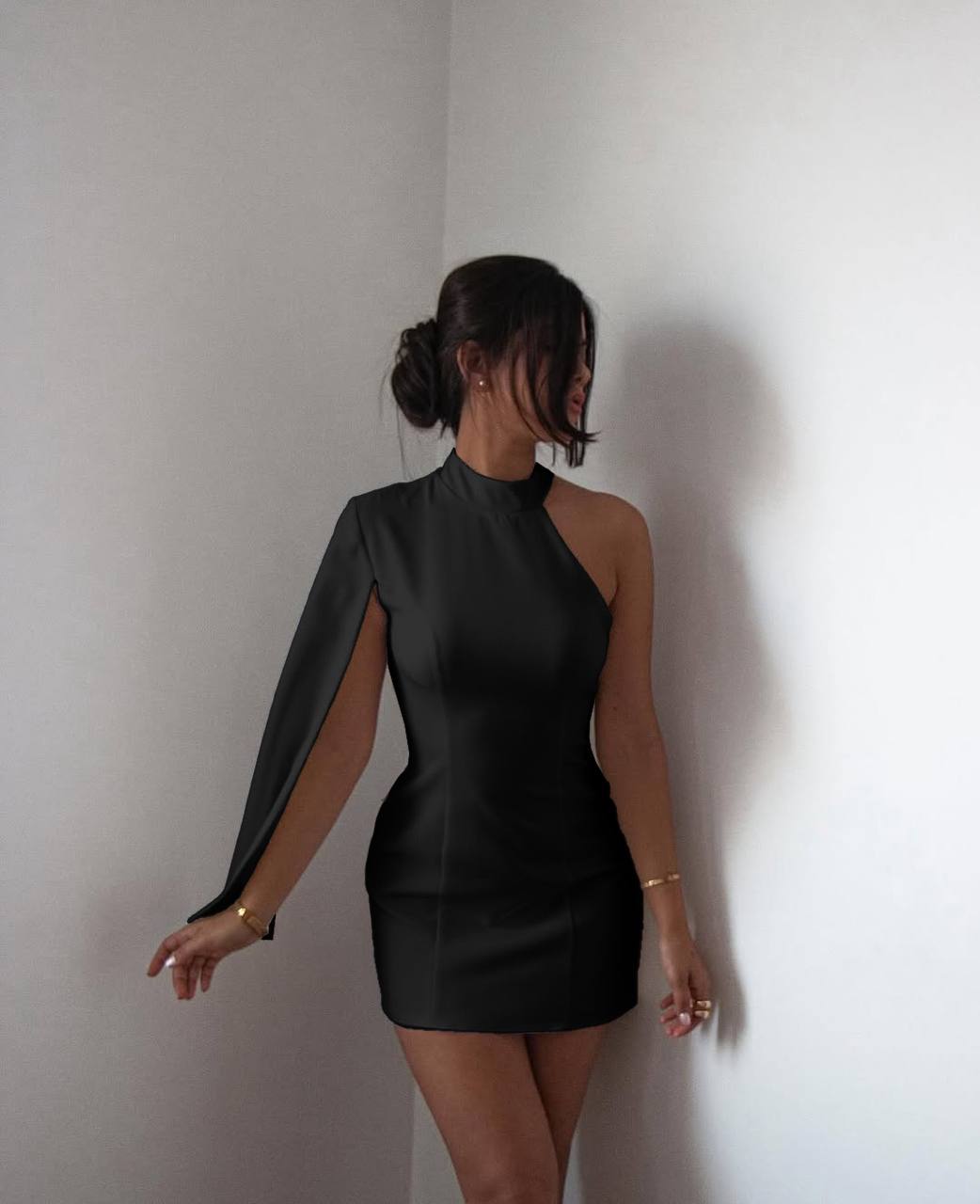 Платье садится по фигуре, визуально уменьшает талию и удлиняет ножки.
