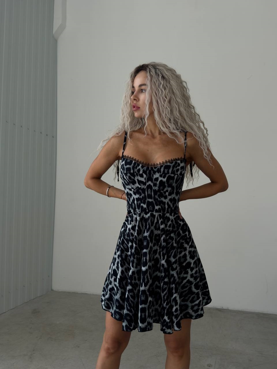 Платье на бретелях с кружевом+расклешенной юбкой в леопардовый принт