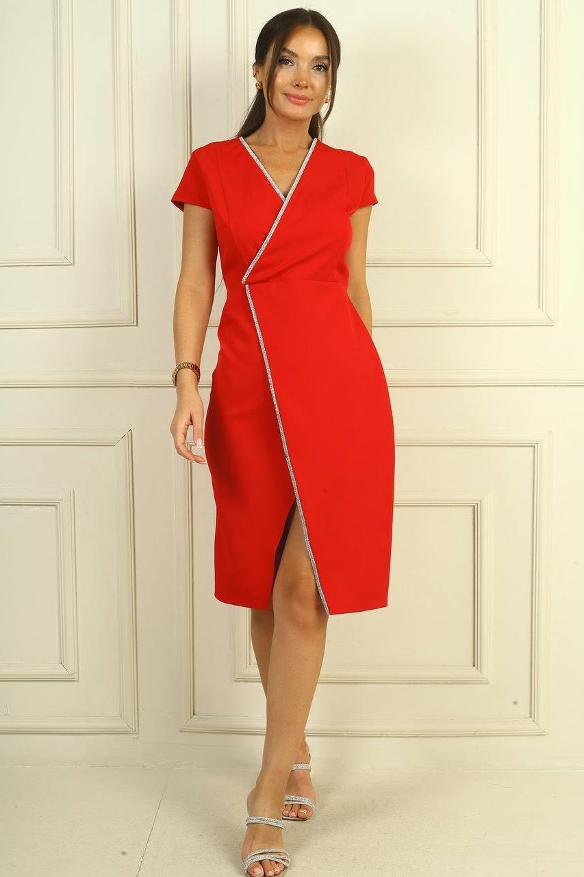 Платье на запах ( ложный),украшенное серебряным кантом красный