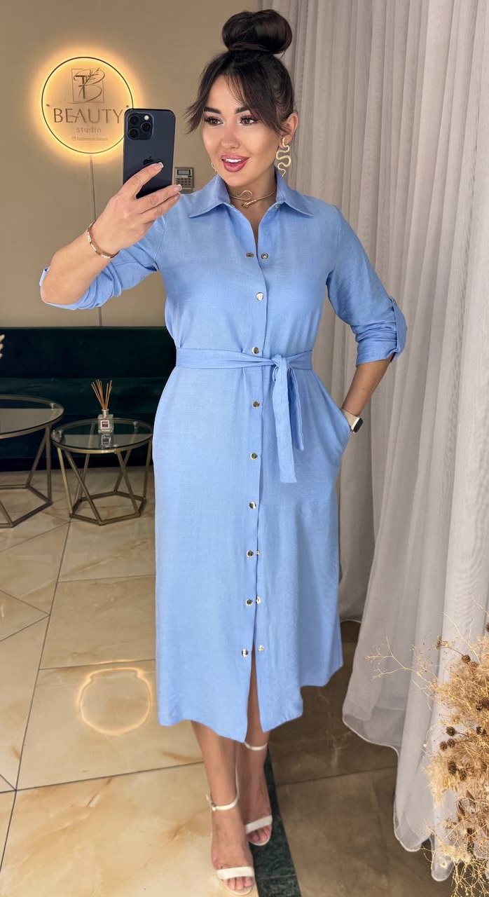 Платье под пояс на пуговицах длиной миди прямого кроя с длинными рукавами лен-жатка голубой