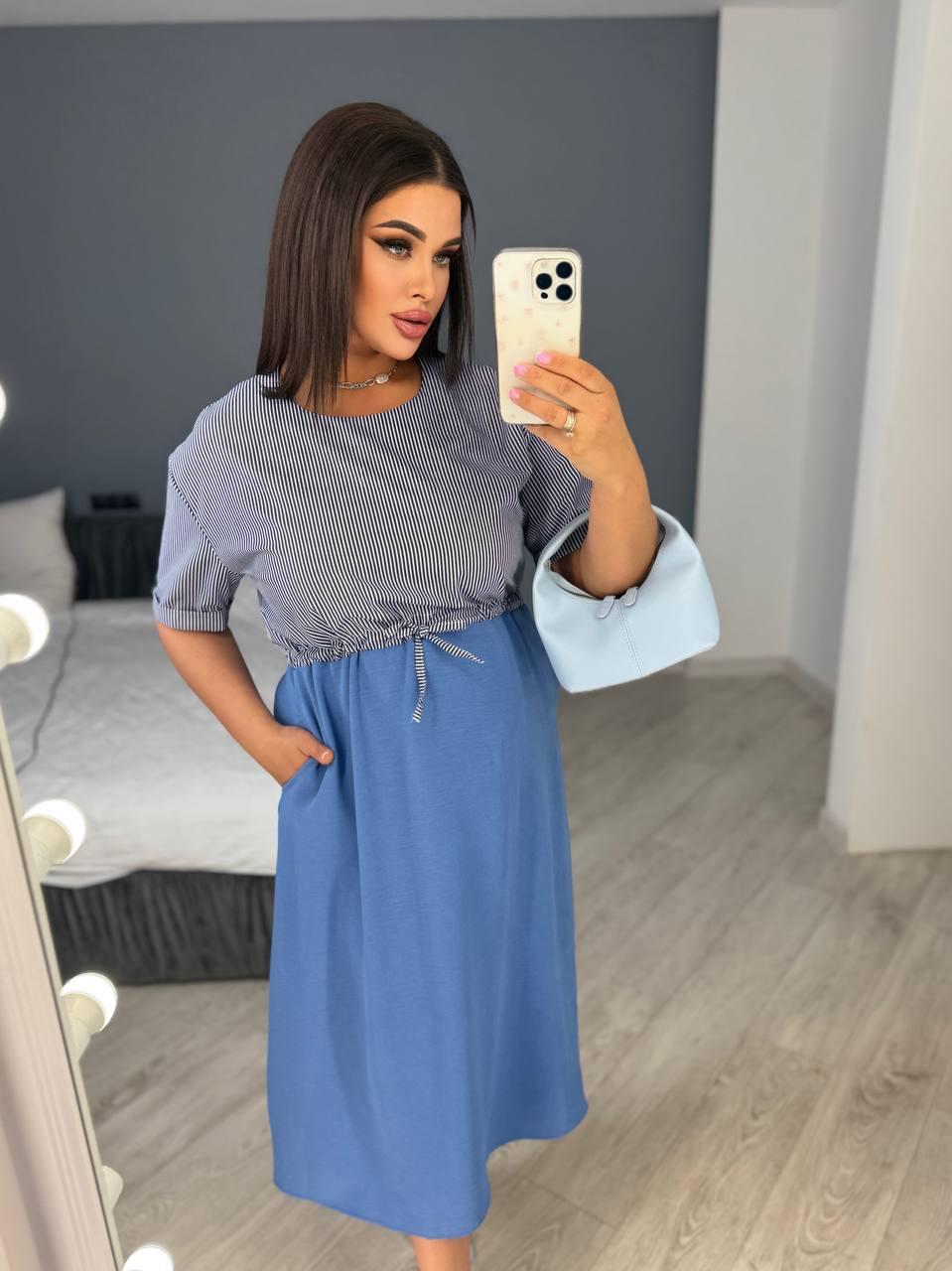 Платье с коротким рукавом, талия на кулиске, с карманами.
