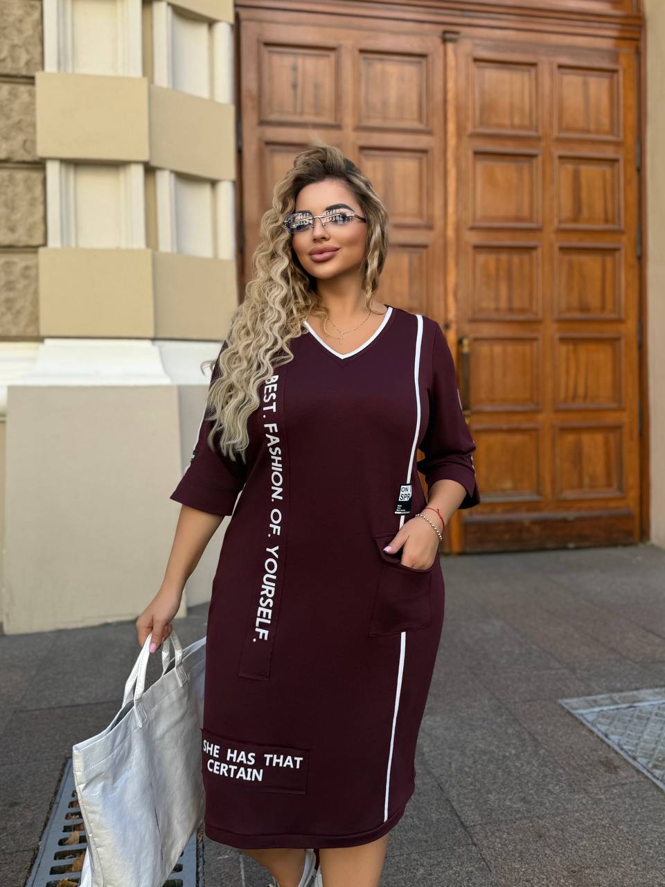 ▫️Платье спорт-шик из двунити. Вдоль платья белый лампас и накат, на талии карман с декоративной молнией, над карманом нашивка. На рукавах также белые лампасы и нашивки
