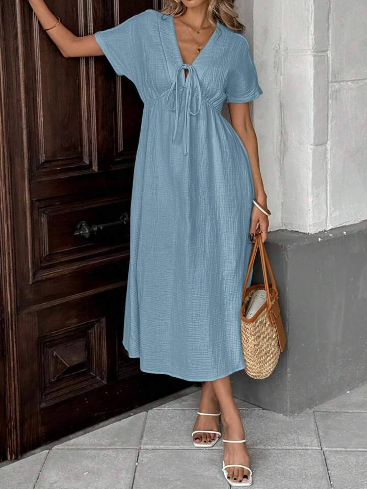 Платье с V-образным глубоким вырезом с завязками спереди голубой