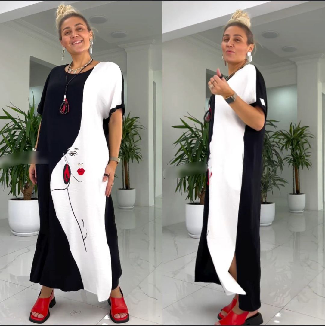 Платье свободного кроя в стиле бохо. Великолепный крой, скрывающий недостатки, и помогает выглядеть на 2 размера меньше. По бокам разрезы. Ткань не парит.