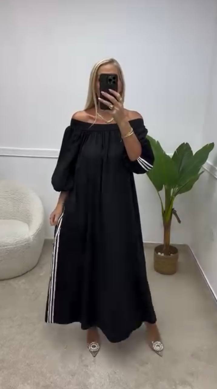Платье украшено спортивной лентой.Сверху платья кашкорсе с внутренней прошитой резинкой, позволяет регулировать высоту на плечах.Есть карман для удобства.