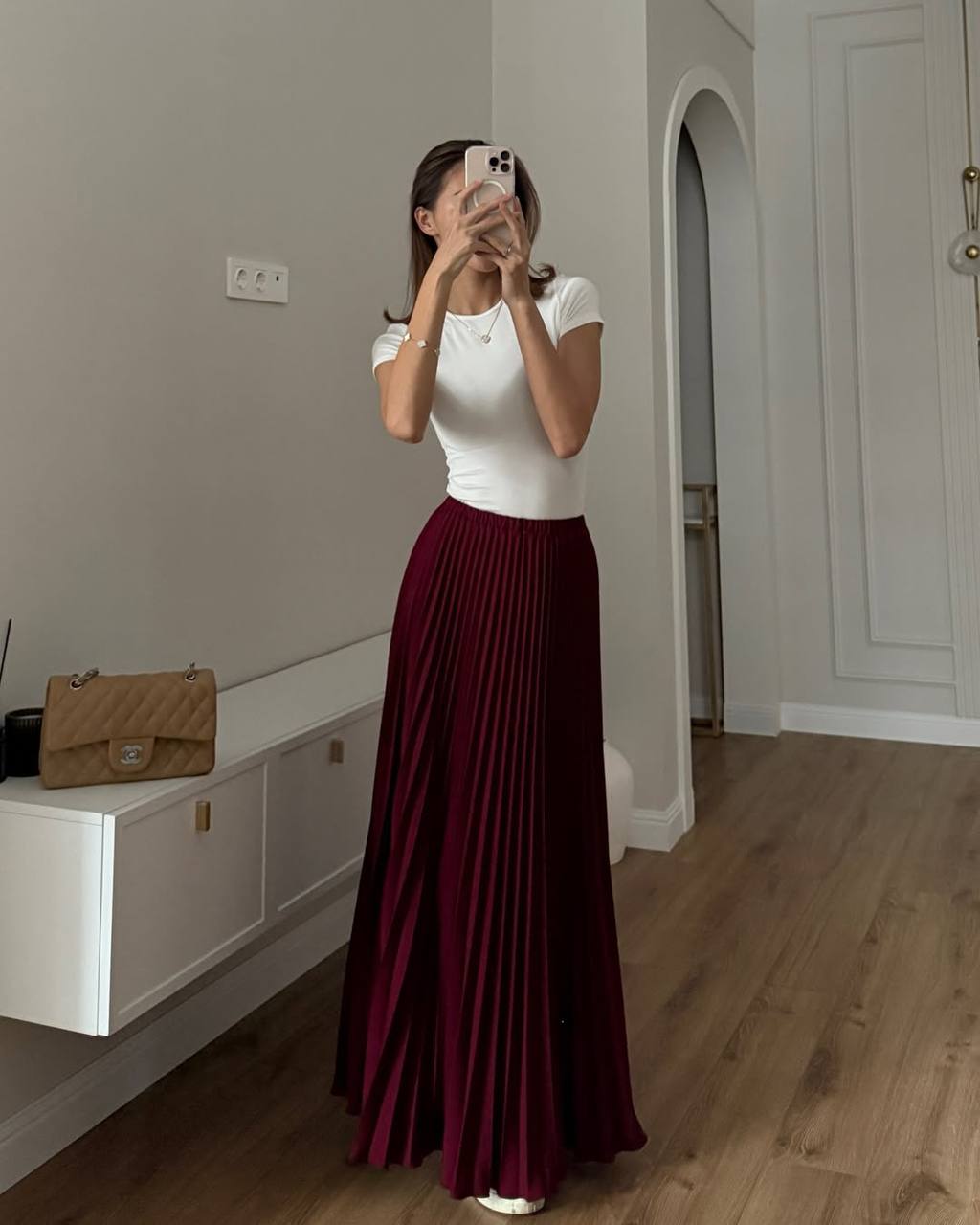 Роскошная плиссированная юбка макси – идеальный выбор для создания нежного, женственного образа. Легкая ткань хорошо держит форму и элегантно развевается во время движения.