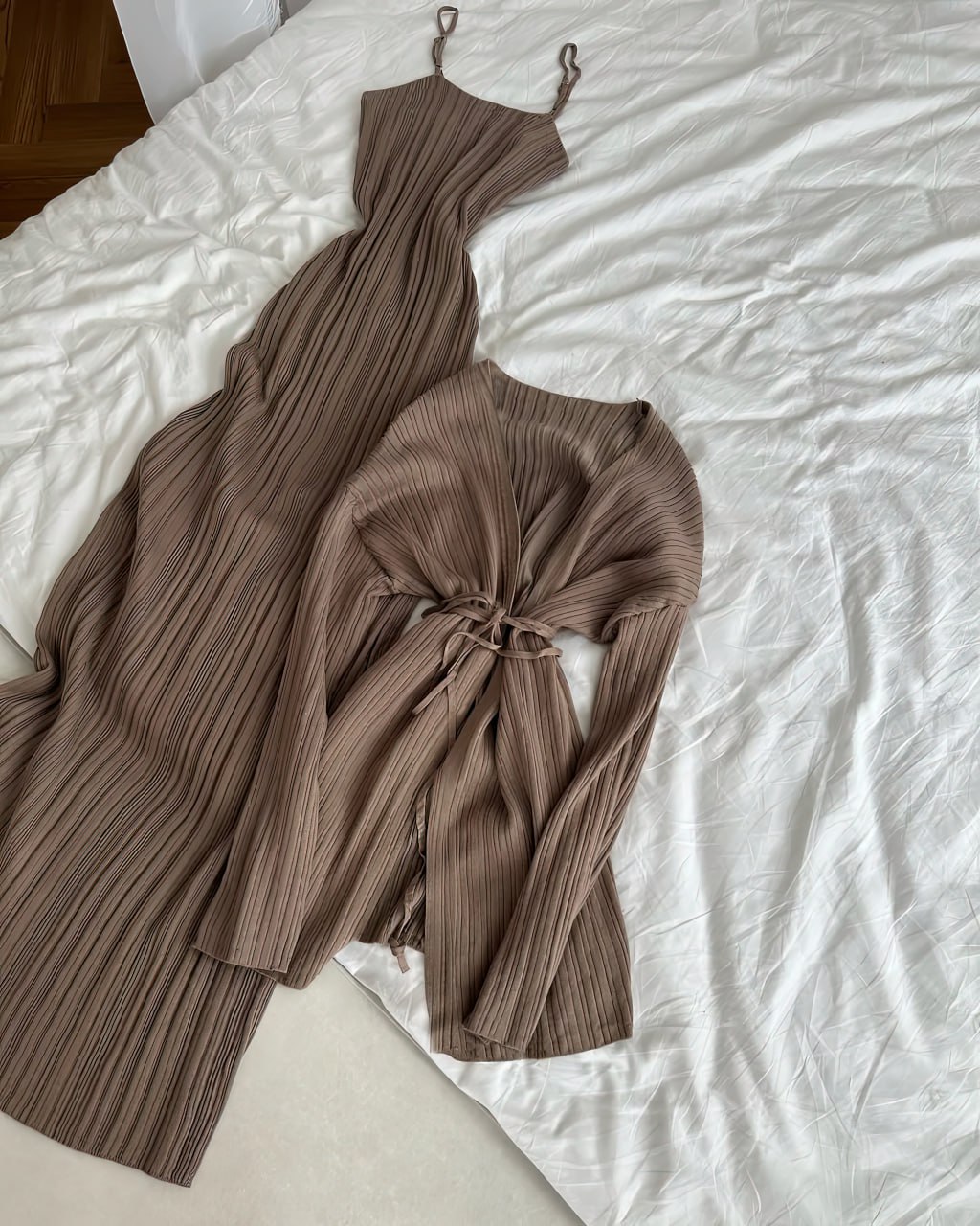 Плиссированные комплекты в нежных оттенках. В набор входят платье на бретелях и лёгкий кардиган с завязкой на талии. Благодаря мягкой фактурной ткани образ выглядит элегантно и одновременно непринужденно.