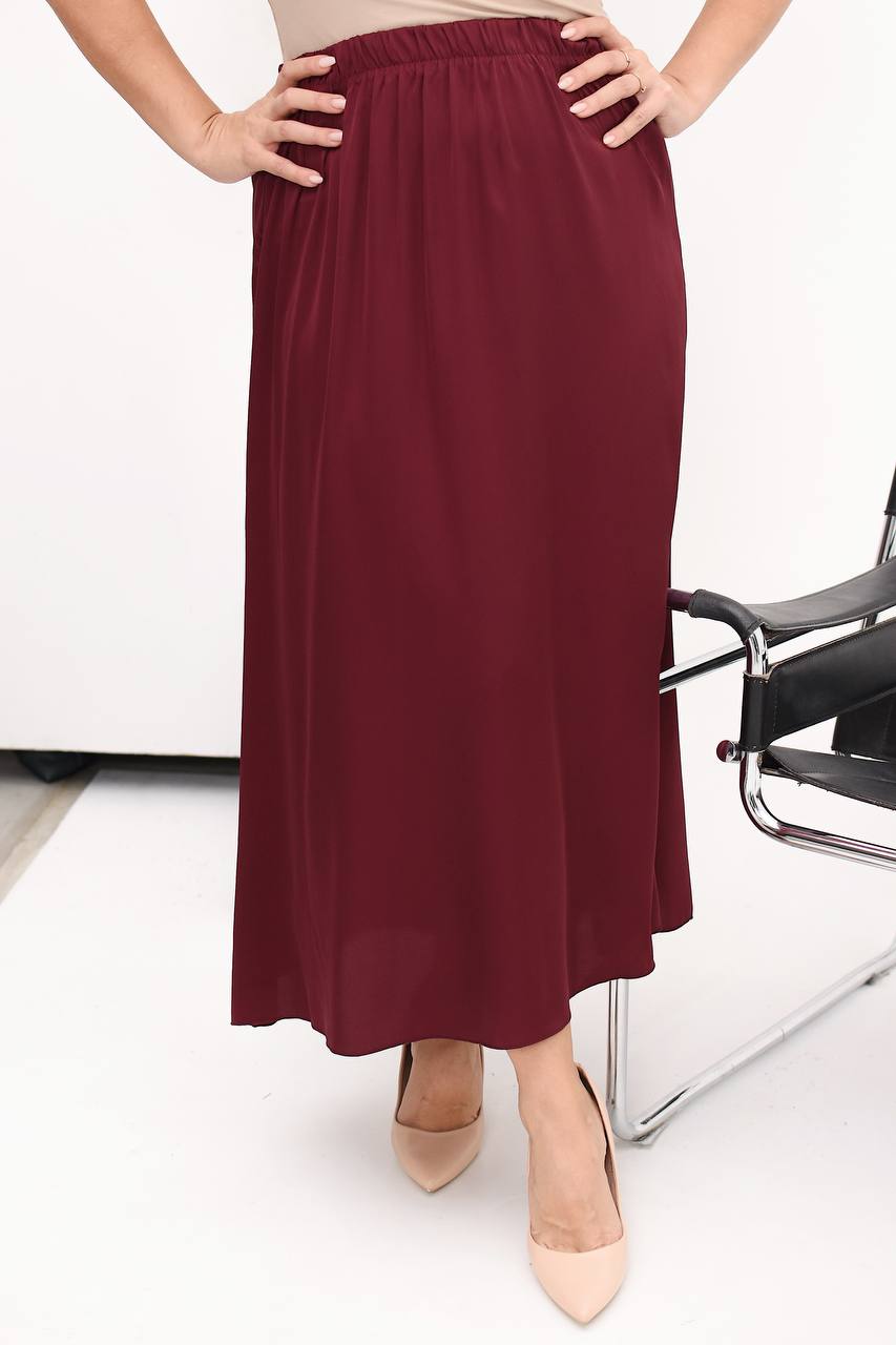 Шелковая юбка меди длины в четырех оттенках: бургунд, изумрудный, черный и шоколадный. Модель с высокой посадкой, эластичным поясом, обеспечивающим комфорт и идеальную посадку. Вариант для обыденного образа или особых случаев. Легко сочетается со свитерами, блузками или топами. Можно подобрать любую обувь, брутальные сапоги, хрупкие туфли, кеды или массивные кроссовки. Идеальная база для создания элегантных и современных лугов.