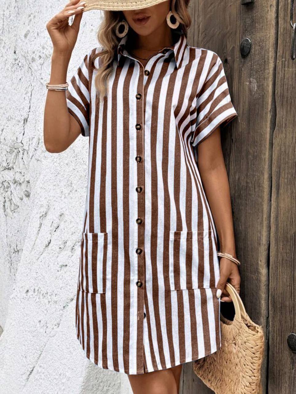 Будьте першим, хто залишив відгук “Повседневное нежное женское платье-рубашка лен полоска мокко”“