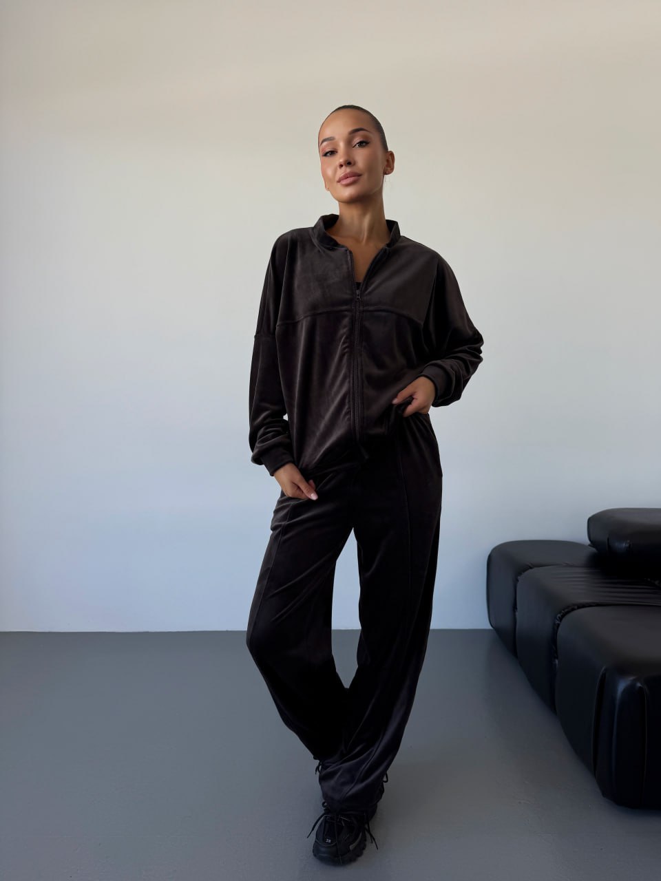 Повседневный велюровый костюм на осень. Кофта свободного кроя на молнии. Брюки прямого кроя, 2-и карманы, талия на резинке.