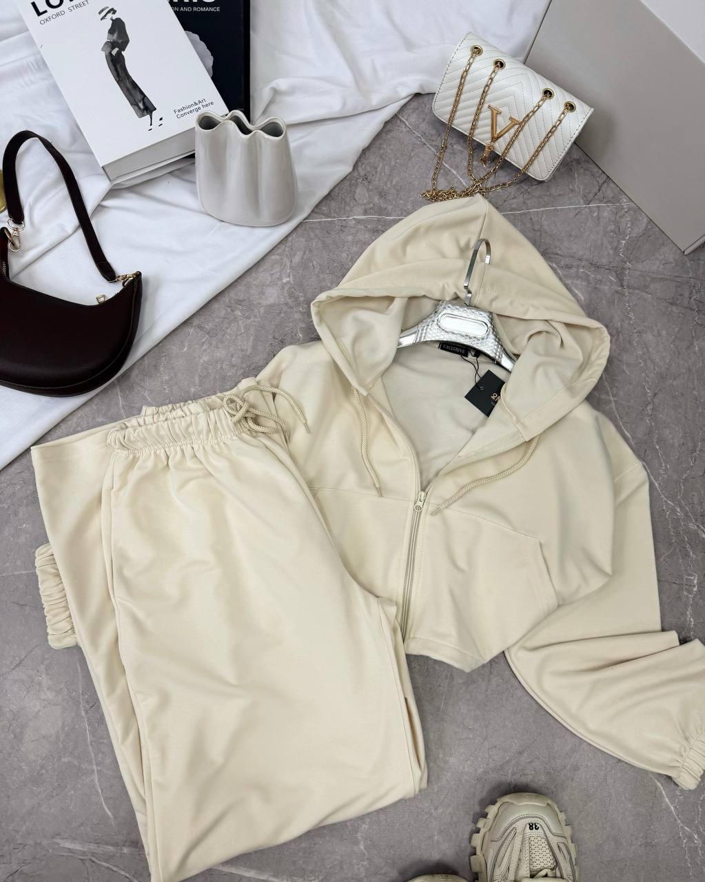 Практический костюм с укороченной кофты с капюшоном на змейке и свободных штанов палаццо. Кофта идет снизу на фиксаторе, чтобы регулировать и носить, как захочется. Ткань приятная, не лохматится и не теряет цвет.