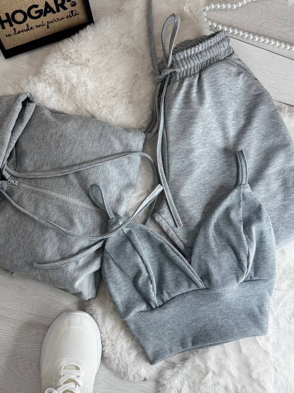 Практичный костюм тройка: кофта+двойной топ+штаны меланж