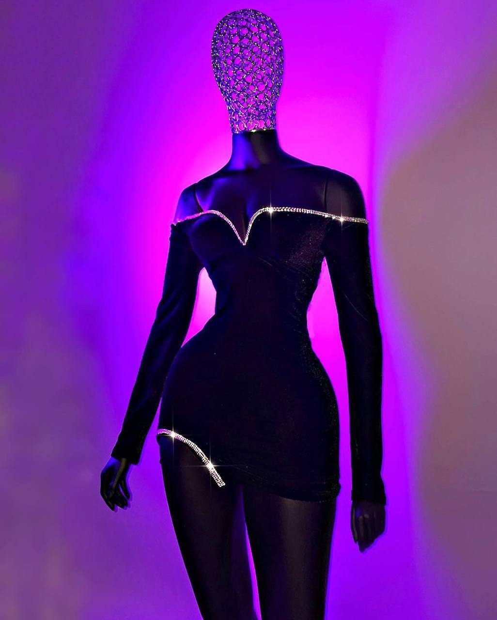 Приталенная модель с акцентом декольте, обработанным стразами, в длине мини.