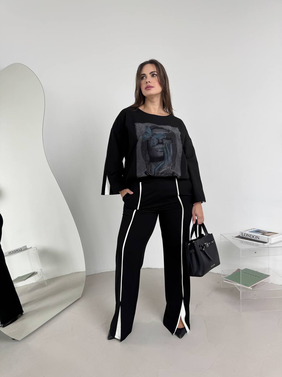 Будьте першим, хто залишив відгук “Прогулочный костюм: кофта украшена стразами+штаны с разрезом черный”“