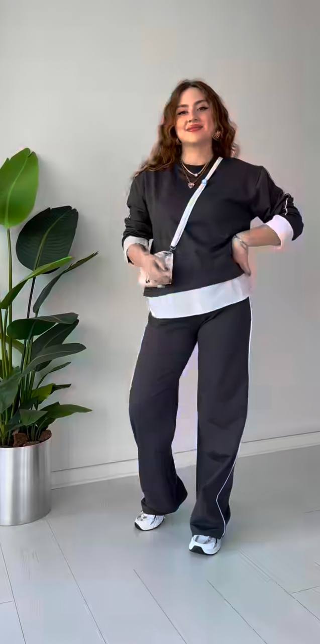 Кофта оригинального кроя выполнена из трикотажа с добавлением белого супер софта на рукавах и снизу с имитацией рубашки. .Брюки палаццо средней посадки на резинке с карманами. Рукава кофты и брюки украшены белой лентой, придающие изделию яркости.