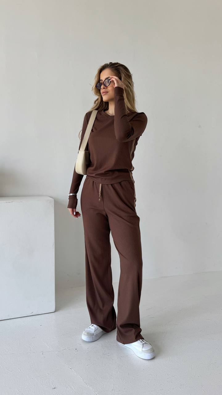 Прогулочный костюм: лонг+штаны-палаццо с лампасами (рубчик мустанг) шоколад
