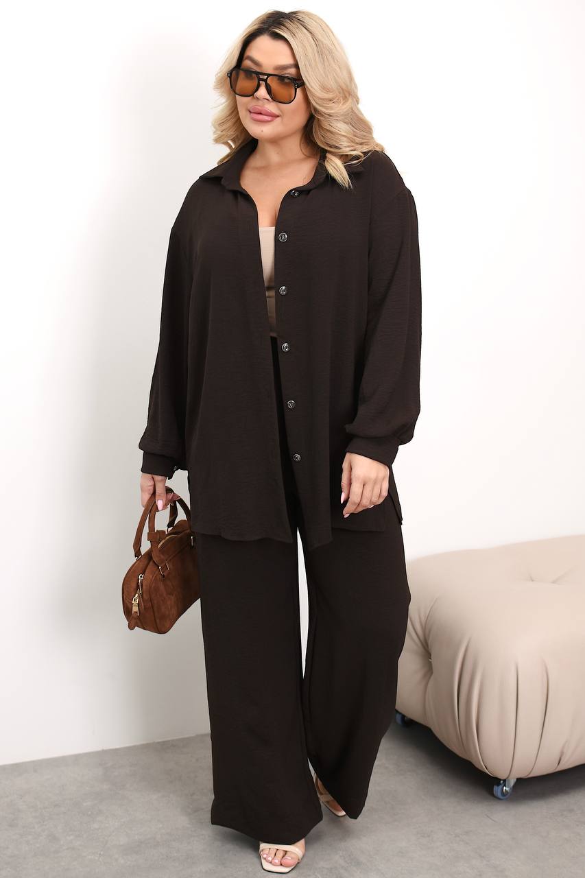Прогулочный костюм: Рубашка свободного кроя на пуговицах+Штаны палаццо средней посадки коричневый