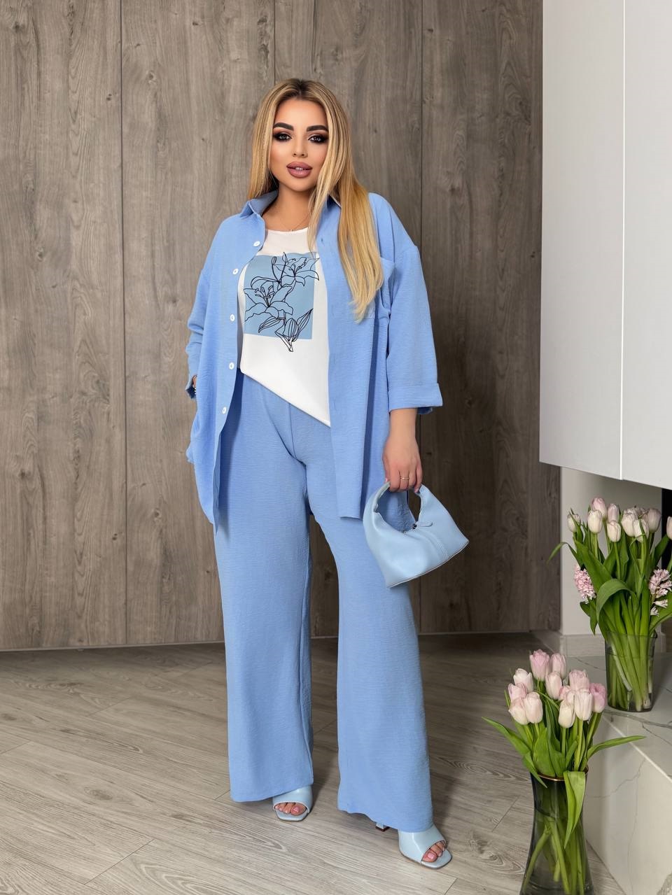 Прогулочный костюм тройка (Рубашка+футболка с сублимацией+брюки палаццо) голубой