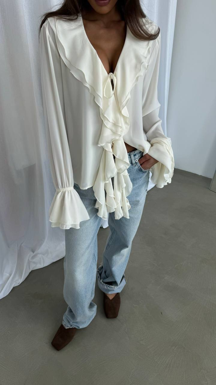 Романтическая шифоновая блузка с воланами. Модель отличается мягким вырезом с завязкой, украшенной