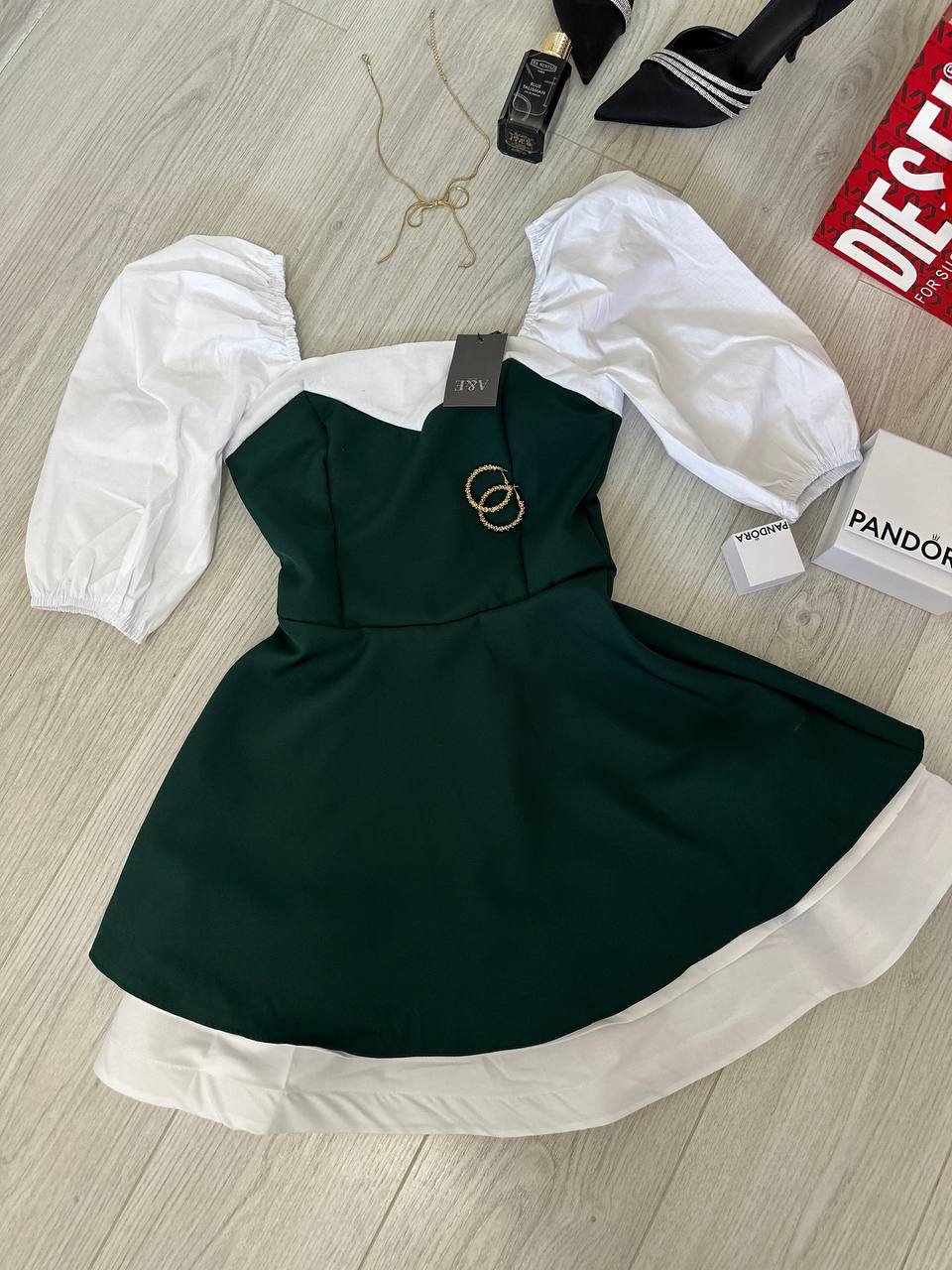 Это платье состоит из двух основных цветов: черного и белого. Верх платья оригинальный дизайн с комбинацией черного корсета и белых рукавов. Черный корсет придает элегантности и подчеркивает талию, в то время как белые короткие объемные рукава создают романтичный и нежный вид. Пышный белый подклад обработан кринолином.