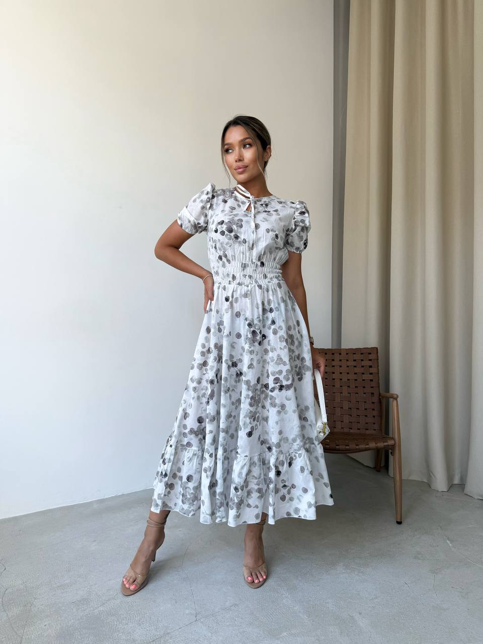 • Подробности: эластичная талия, волан по низу, завязка у горловины.