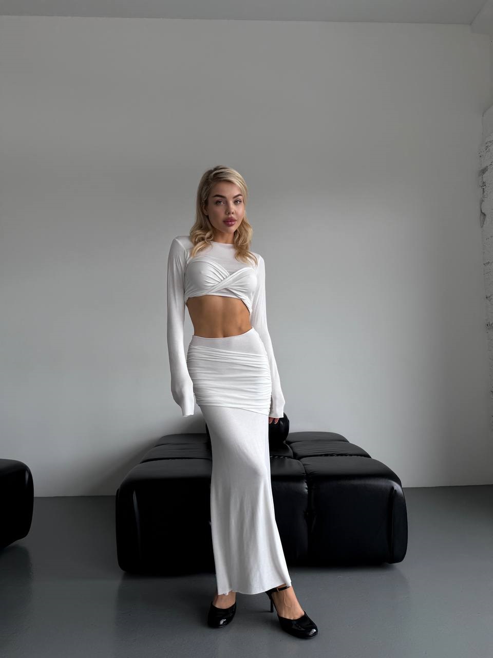 Головна » Магазин » Одяг » Жіночі костюми » Роскошный костюм (юбка макси с драппировкой+укороченный лонгслив с красивым лифом) молочный