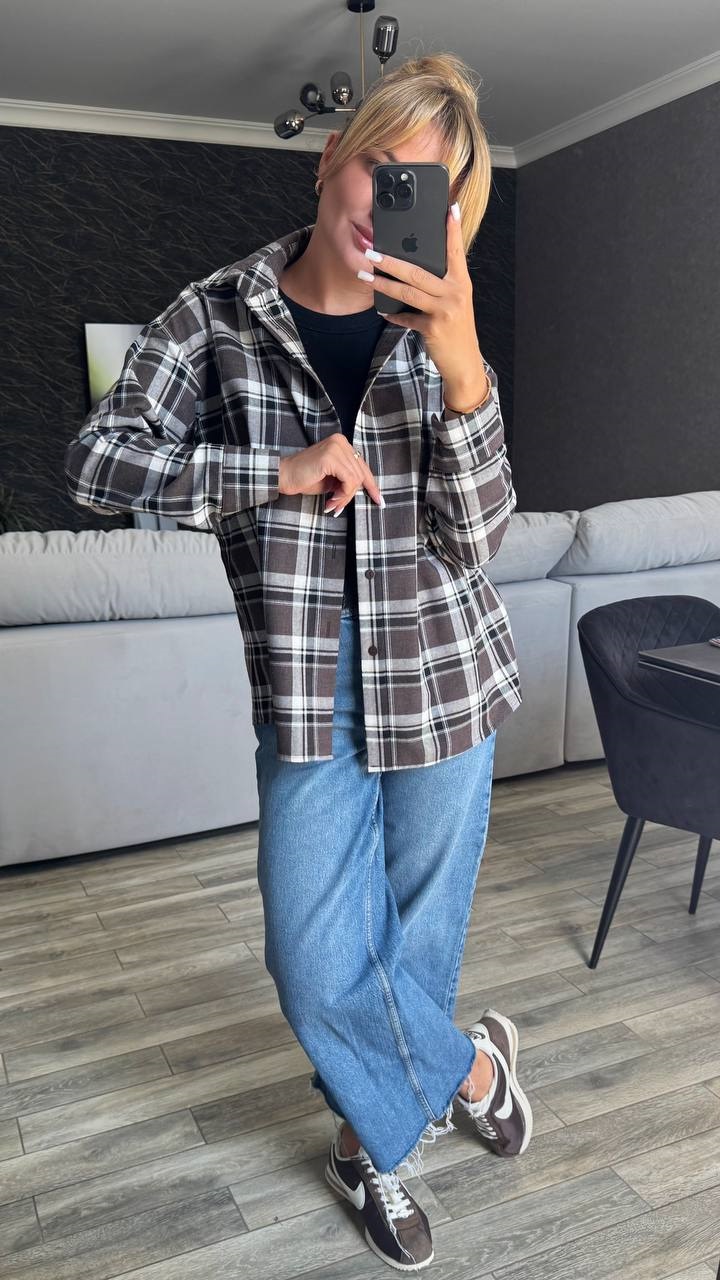 Головна » Магазин » Одяг » Куртки сорочки » Рубашка прямого кроя в клетку+рукав длинный шоколадный с белым
