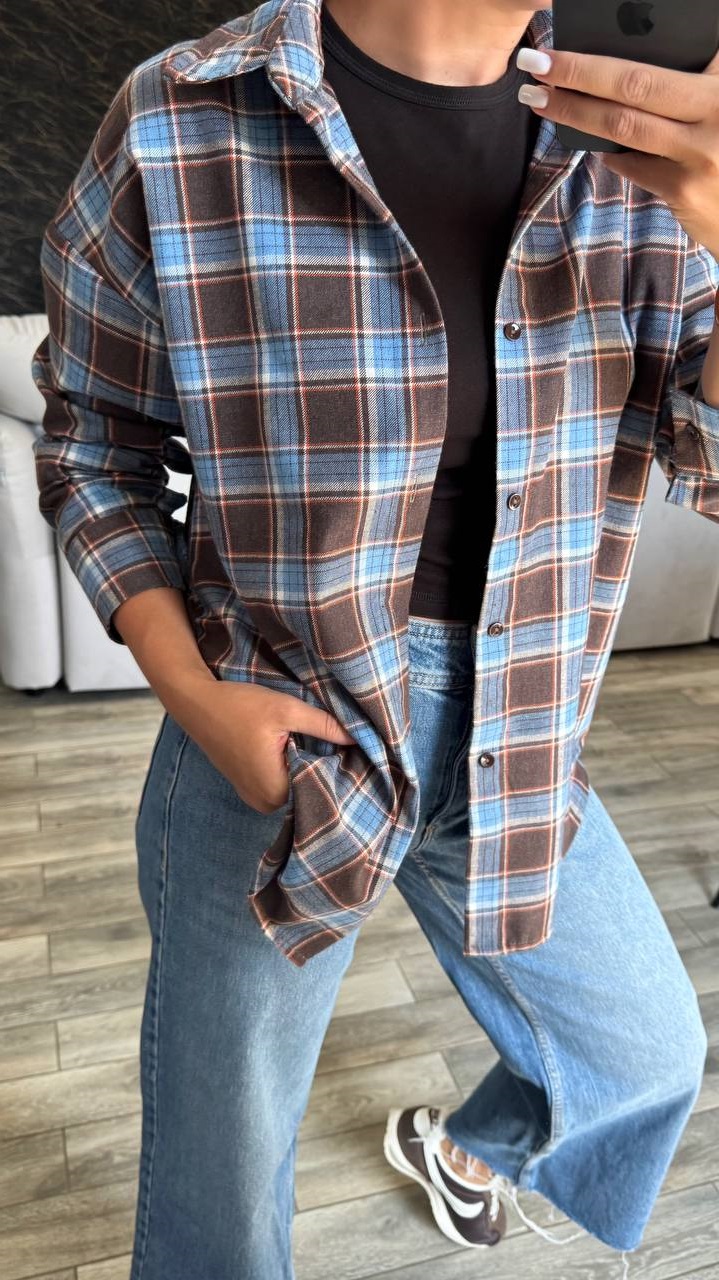 Головна » Магазин » Одяг » Куртки сорочки » Рубашка прямого кроя в клетку+рукав длинный джинсово-шоколадный