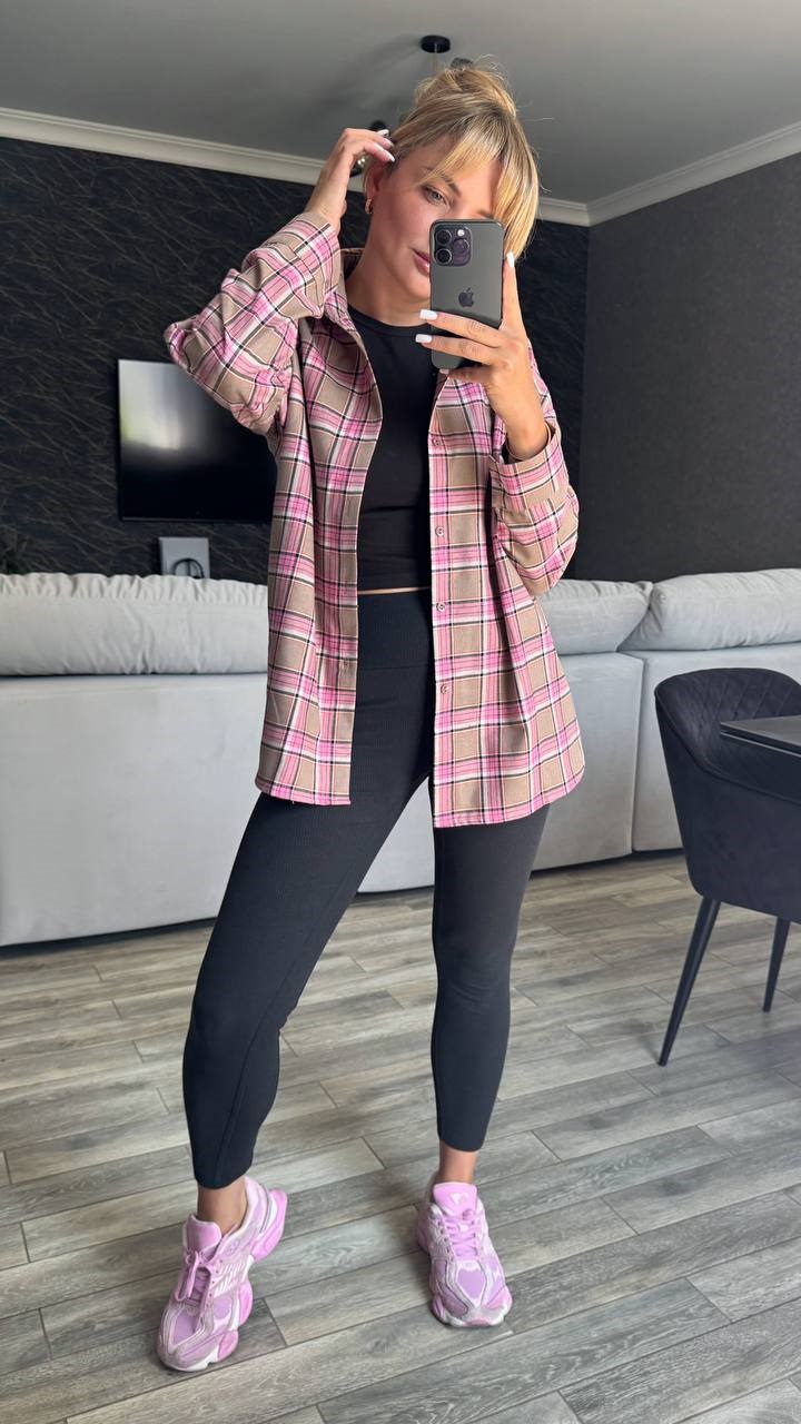Головна » Магазин » Одяг » Куртки сорочки » Рубашка прямого кроя в клетку+рукав длинный розовый+бежевый