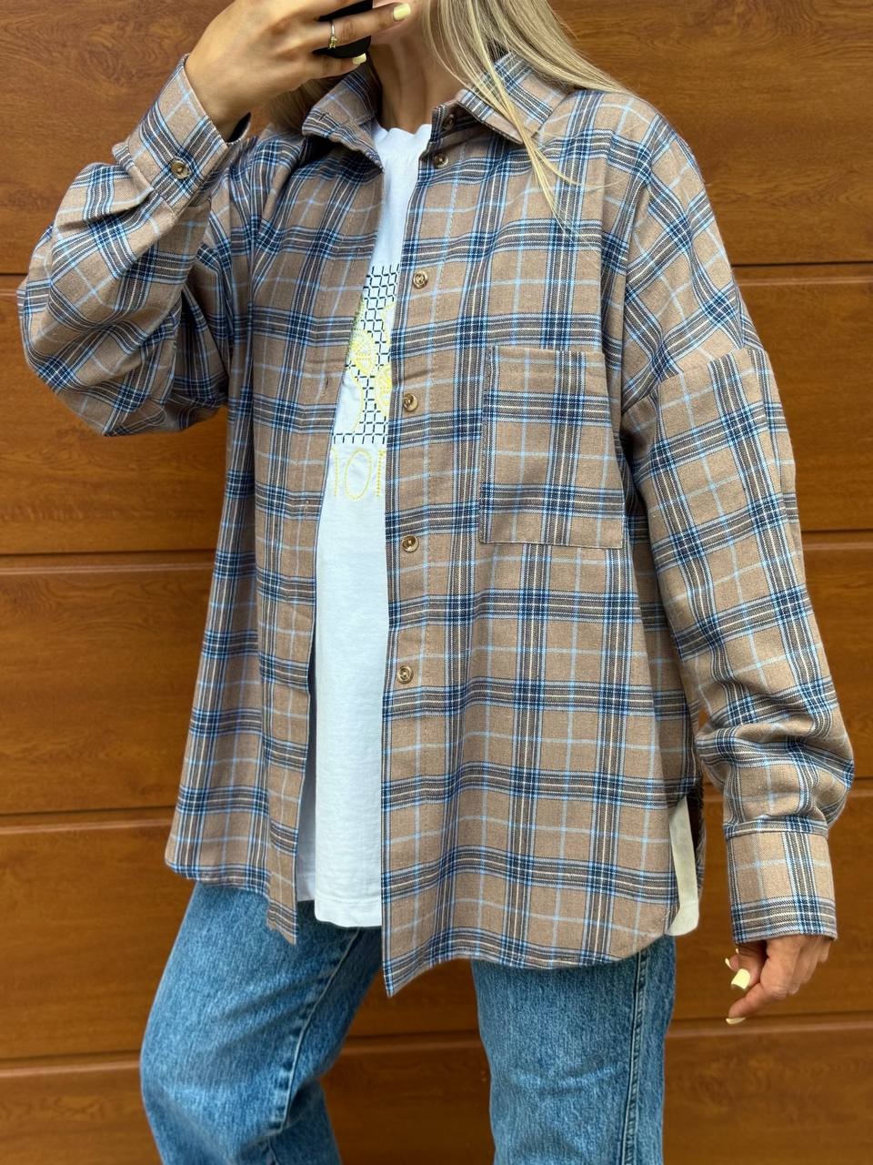 Будьте першим, хто залишив відгук “Рубашка с длинным рукавом в клетку оверсайз фланель бежевый с голубой полоской”“