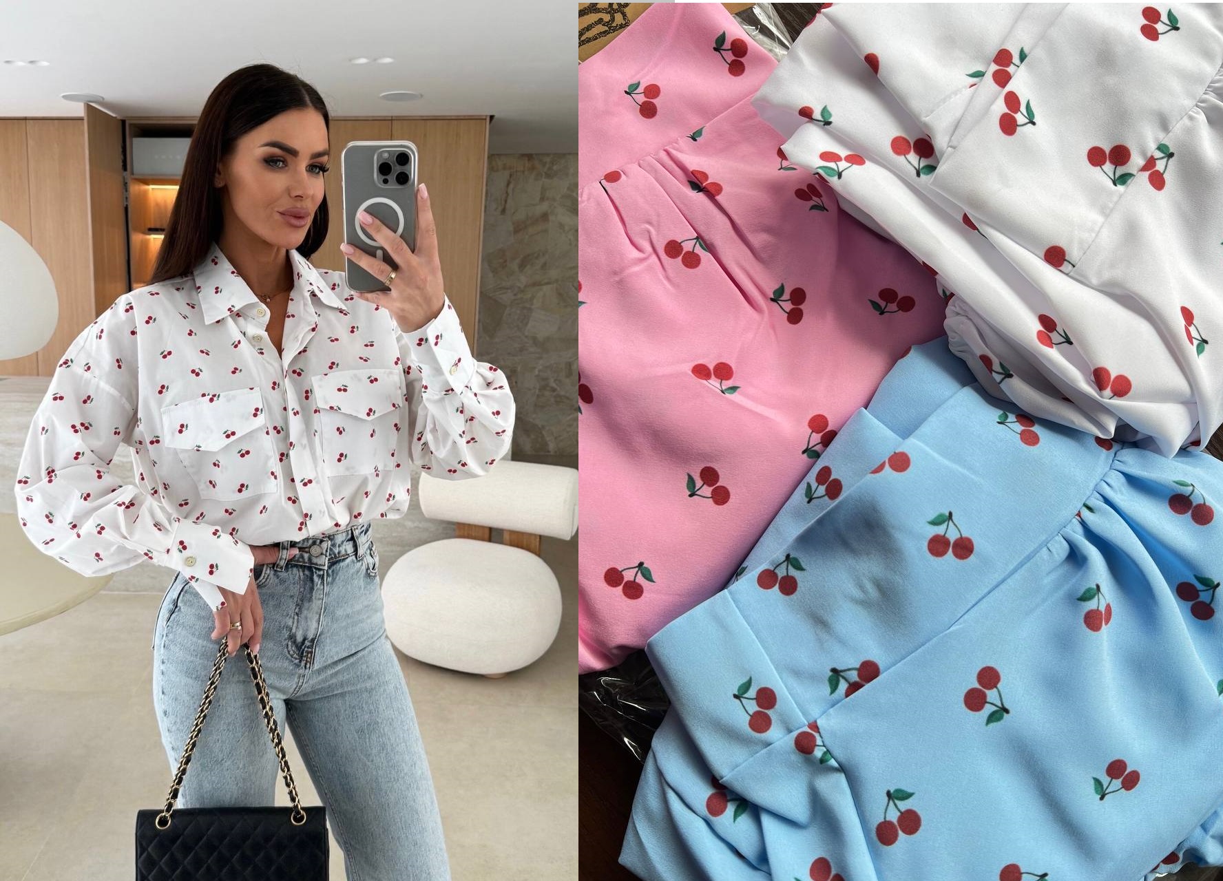 Стильная рубашка с узором сладкой вишни, свободного кроя, рукав с увеличенным манжетом застегивается на пуговицу, по переду изделия накладные карманы, пуговицы скрыты под планкой – отличное решение для создания стильного образа