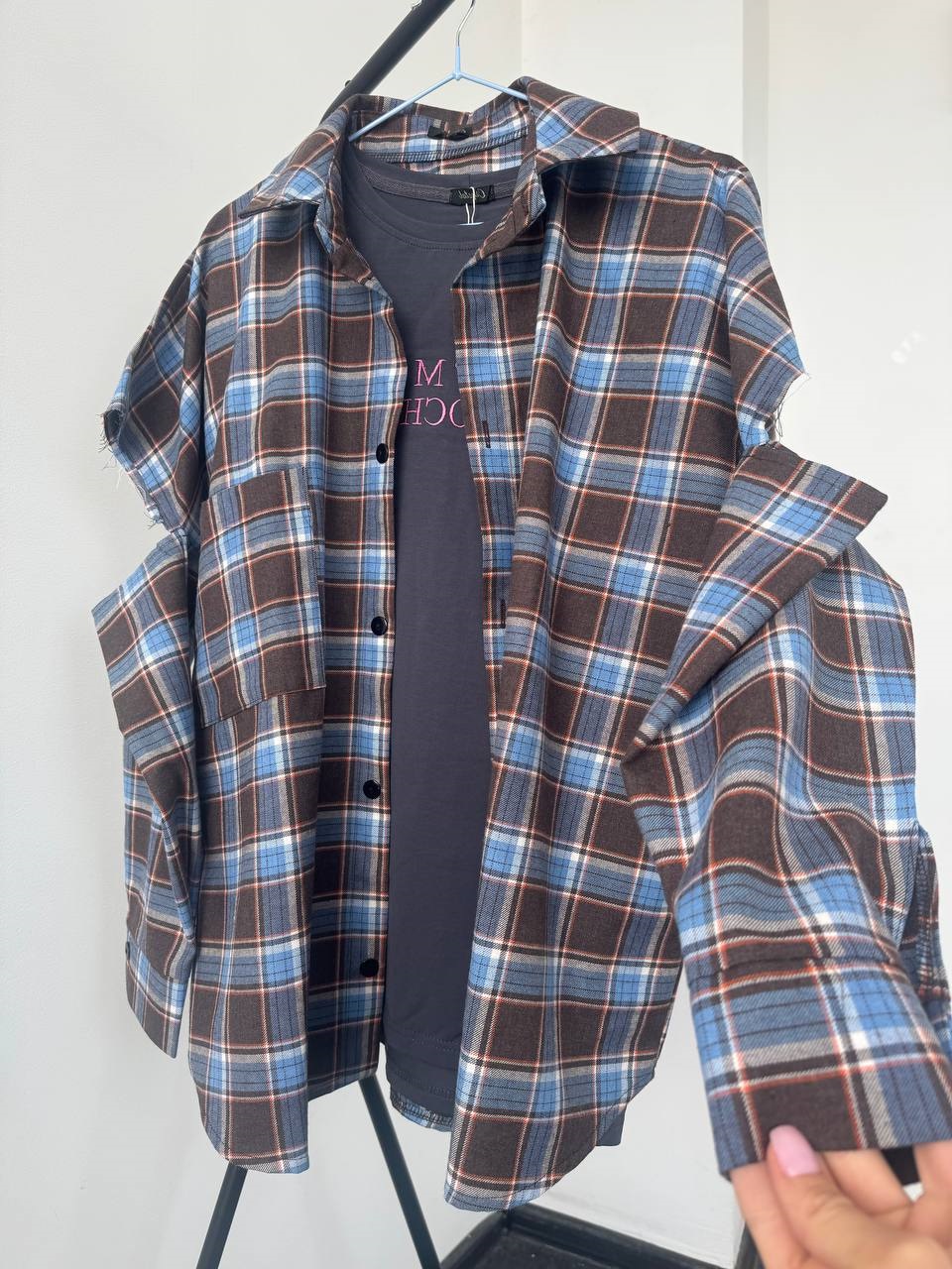 Будьте першим, хто залишив відгук “Рубашка в клетку с эффектом надорванных рукавов шоколадно-голубой”“
