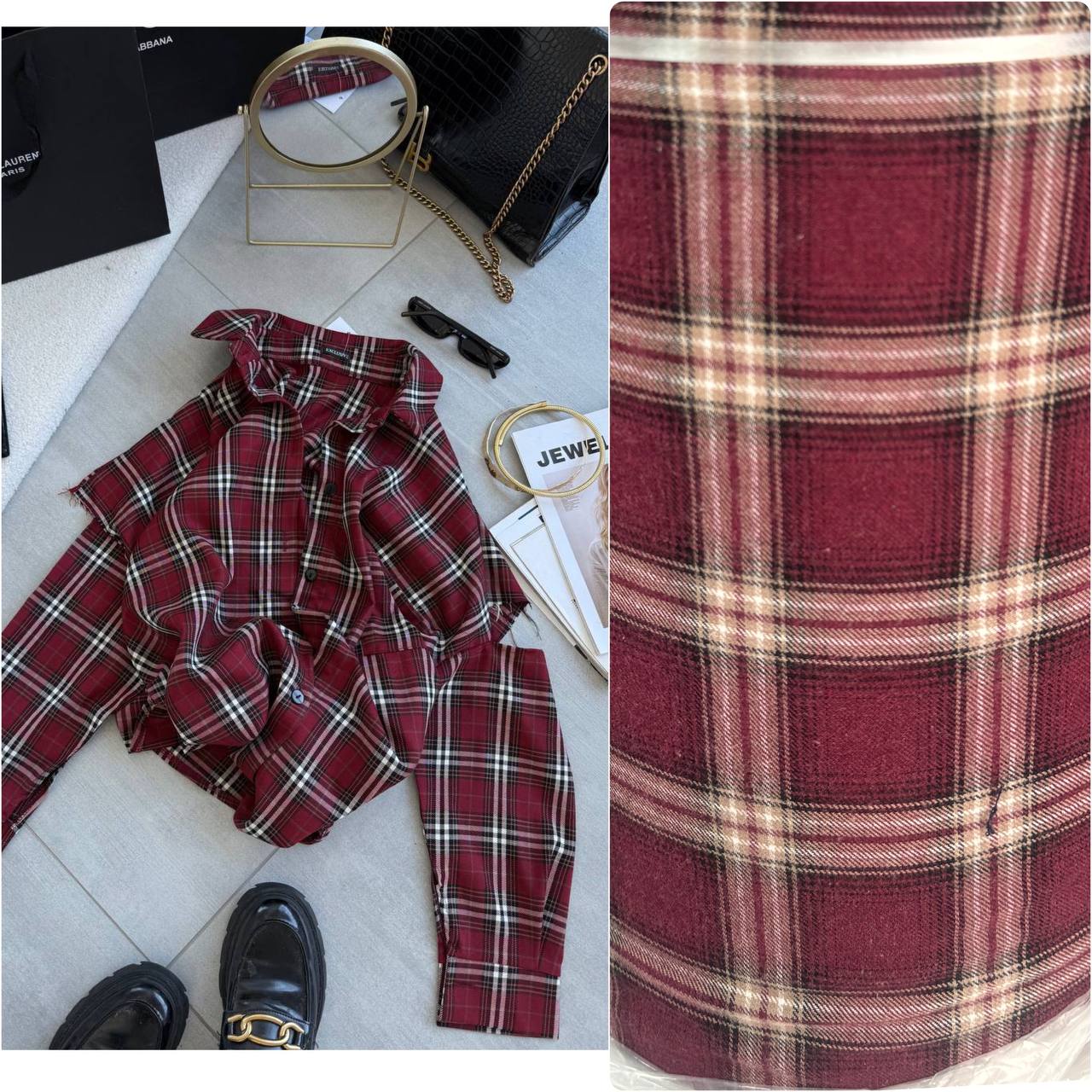 Будьте першим, хто залишив відгук “Рубашка в клетку с эффектом надорванных рукавов бордо”“