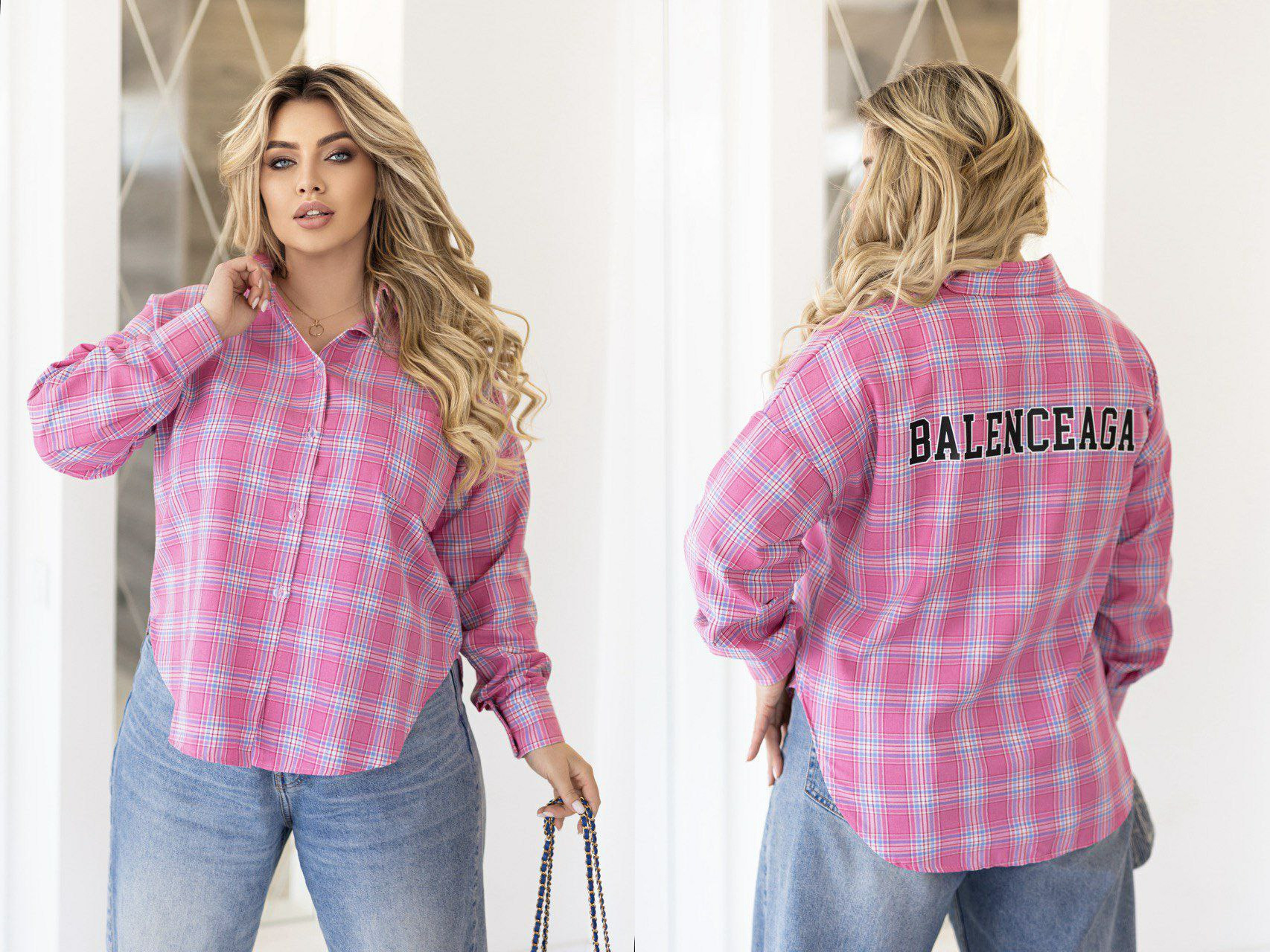 Рубашка в клетку с принтом на спине коттон розовый+двойная голубая полоска