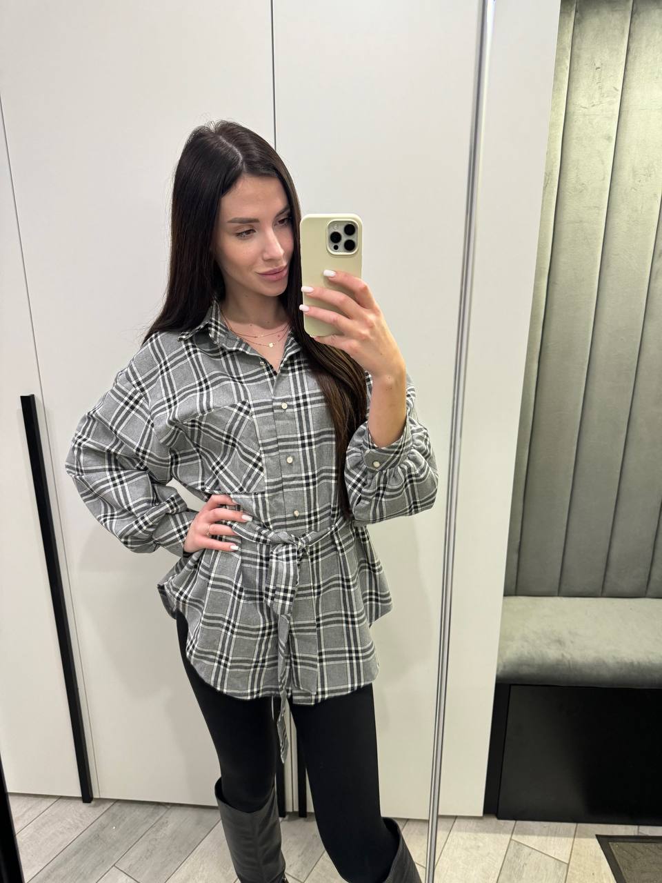 Рубашка Размеры: 42-44, 46-48 Ткань : фланель Цвет: беж, серая Стильная и легкая рубашка, идеальная вещь, которая подойдет к любому образу! Пояс уходит в комплекте!