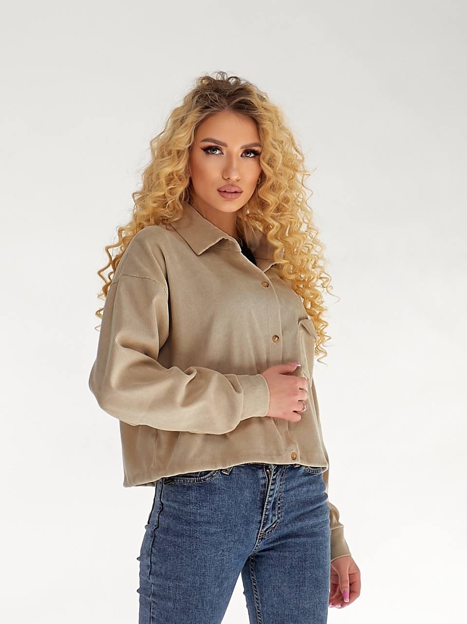 Рубашка укорочена на пуговицах с воротником и декоративным карманом на груди.